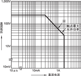 (例)上表中,觸點電壓為DC60V時,觸點電流的最大值=1A。……(※),這是電阻負荷的值,使用時請務(wù)必確認實際負載。