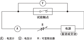 指觸點之間接觸的觸點接觸電阻與端子和接觸彈簧的導(dǎo)體電阻的總電阻。接觸電阻的測定用下圖的電壓下降法進行。測定電流如下表所規(guī)定。(根據(jù)JIS C5442。)