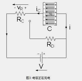 若電容與直流電源相接,見圖3,電路中有電流流通。兩塊板會(huì)分別獲得數(shù)量相等的相反電荷,此時(shí)電容正在充電,其兩端的電位差vc逐漸增大。一旦電容兩端電壓vc增大至與電源電壓V相等時(shí),vc = V,電容充電完畢,電路中再?zèng)]有電流流動(dòng),而電容的充電過程完成。