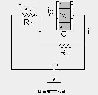 當(dāng)切斷電容和電源的連接后,電容通過電阻RD進(jìn)行放電,兩塊板之間的電壓將會(huì)逐漸下降為零,vc = 0,見圖4。