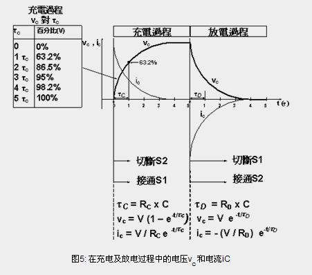 電阻值R和電容值C的乘積被稱為時(shí)間常數(shù)τ,這個(gè)常數(shù)描述電容的充電和放電速度,見圖5。