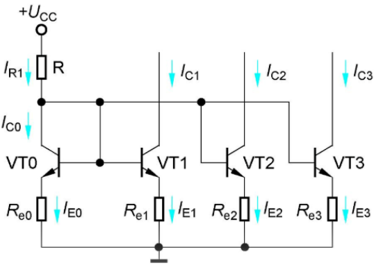集成運放是一個多級放大電路,因而需要多路恒流源電路分別給各級提供合適的靜態(tài)電流?梢岳靡粋基準(zhǔn)電流去獲得多個不同的輸出電流,以適應(yīng)各級的需要。下圖所示電路是在比例恒流源基礎(chǔ)上得到的多路恒流源電路,IR為基準(zhǔn)電流,IC1、IC2和IC3為三路輸出電流。由于各管的b-e間電壓UBE數(shù)值大致相等,因此可得近似關(guān)系: